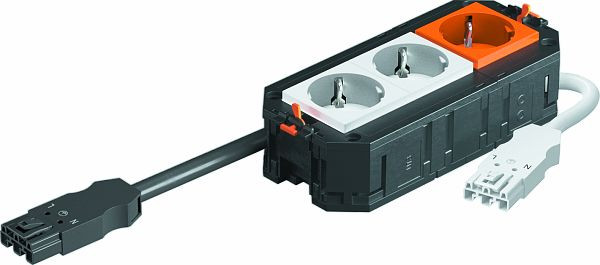 Der anschlussfertige Universalträger UTC3 verfügt über 2 vorinstallierte 33°-Schutzkontaktsteckdosen in weiß mit 16 A und eine vorinstallierte 33°-Schutzkontaktsteckdosen in orange mit 16 A. Passend zu den Verbindungsleitungen VL und den Geräteeinbaueinheiten der Nenngröße 2, 4, R4, 6 und R7.