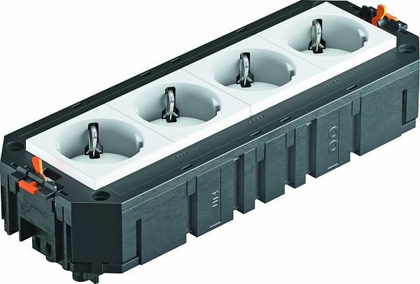Der anschlussfertige Universalträger UTC4 verfügt über vier vorinstallierte 33° Schutzkontakt-Steckdosen mit 16 A. Passend zu den Verbindungsleitungen VL und den Geräteeinbaueinheiten der Nenngröße R7, R9 und 9.