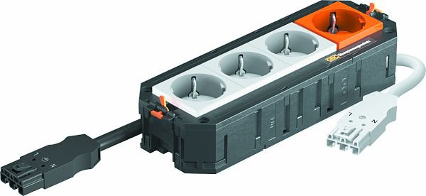 Der anschlussfertige Universalträger UTC4 verfügt über 3 vorinstallierte 33°-Schutzkontaktsteckdosen in weiß und eine vorinstallierte 33°-Schutzkontaktsteckdose in orange (mit Überspannungsschutzmodul Typ 3 nach DIN EN 61643-11), 250 V~ 16 A. Passend zu den Verbindungsleitungen VL und den Geräteeinbaueinheiten der Nenngröße R7, R9 und 9.
