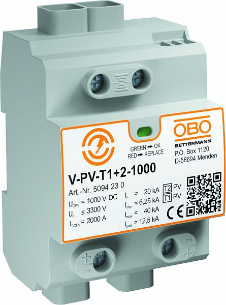 Typ 1+2 Kombiableiter zum Blitz- und Überspannungsschutz für PV-Anlagen.