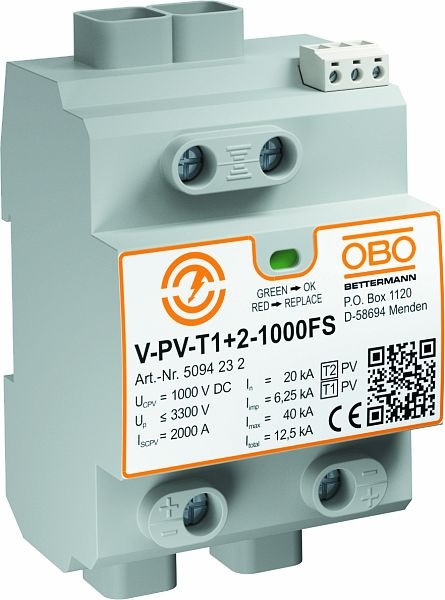 Typ 1+2 Kombiableiter nach EN 50539-11 zum Blitz- und Überspannungsschutz für PV-Anlagen.