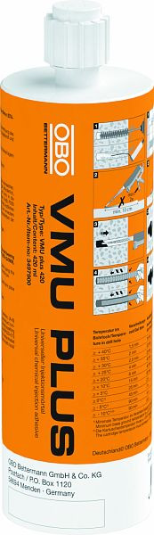 Styrenfreier Vinylester-Verbundmörtel zur spreizfreien Verankerung hoher Lasten mit Gewinde-Ankerstangen. Koaxialkartusche inklusive 1 Mischrohr, zu verarbeiten mit Auspresspistole Typ VM-P 380 Profi.