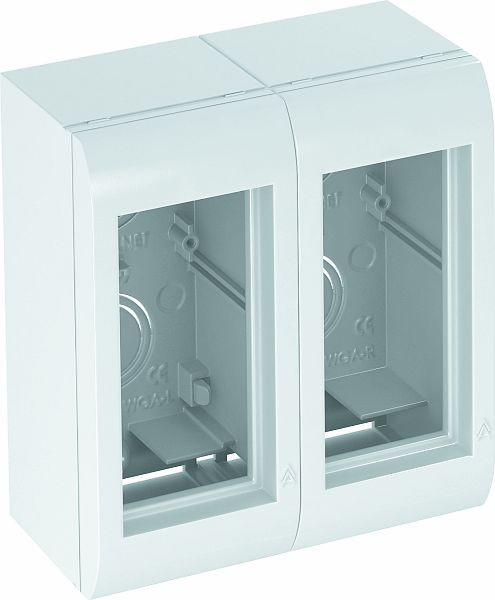Basiskonfiguration bestehend aus 2 Gehäuseunterteilen (rechte und linke Seite) mit 2 Abdeckrahmen zur Aufnahme von Modul 45-Geräten in 2facher Modulbreite = 90mm.