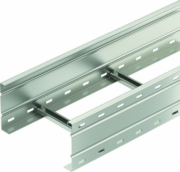 Weitspann-Kabelleiter mit gelochtem Seitenholm in 160 mm Seitenhöhe. Befestigung von Kabeln und Leitungen mit Bügelschelle Typ 2056.