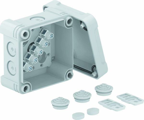 | Kurzbeschreibung | Kabelabzweigkasten mit Klemmleiste 95x95x60 Polycarbonat lichtgrau RAL 7035 |