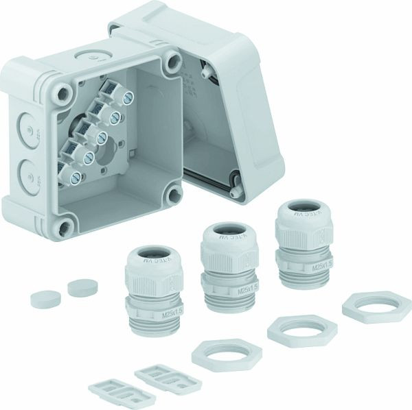 Inklusive Klemmleiste, 3 Kabelverschraubungen V-TEC M20 und 3 Gegenmuttern.