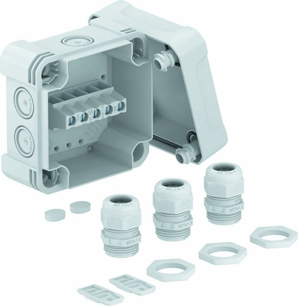 Inklusive Klemmleiste, 3 Kabelverschraubungen V-TEC M25 und 3 Gegenmuttern.