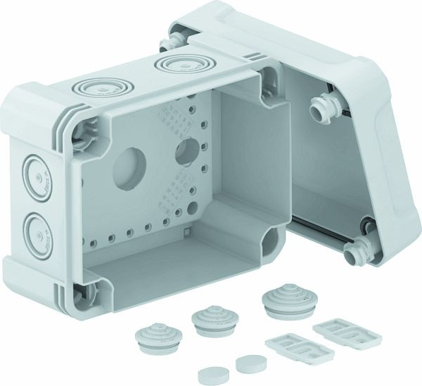 Kabelabzweigkasten zum Verbinden von Kabeln und Leitungen im Innen- und Außenbereich. Rechteckige Form mit Ausschlageinführungen. Geeignet für die Wand-/ Deckenmontage mit der Möglichkeit zur Außenbefestigung, Innenbefestigung oder Montage über die Eckdome. Besonders schlagfest mit IK09. Deckel mit Schnellverschluss, plombierbar. Hergestellt aus halogenfreien und UV-resistenten Materialien.