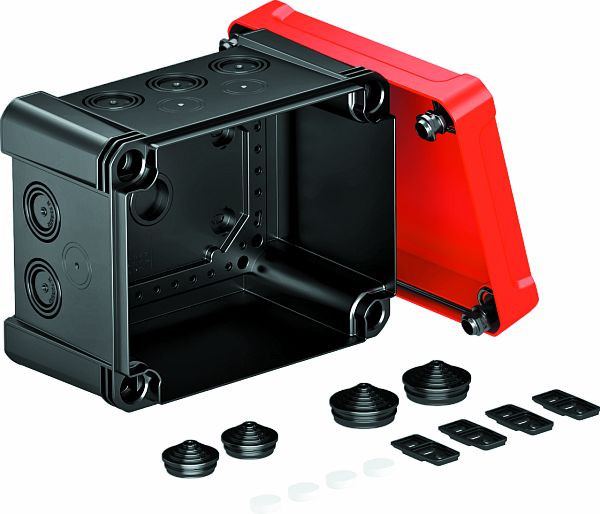 | Kurzbeschreibung | Kabelabzweigkasten mit rotem Deckel 190x150x125 Polycarbonat schwarz / rot |