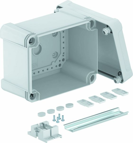 | Kurzbeschreibung | Leergehäuse mit Schiene 2069 190x150x125 Polycarbonat lichtgrau RAL 7035 |