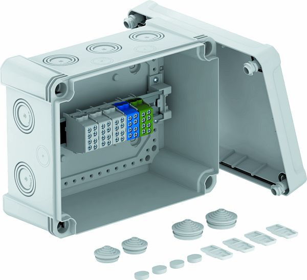 Inklusive 5-poliger Hauptleitungsabzweigklemme, jede mit 2 x 25 mm² + 2 x 16 mm² Leiteranschlussquerschnitten pro Pol.