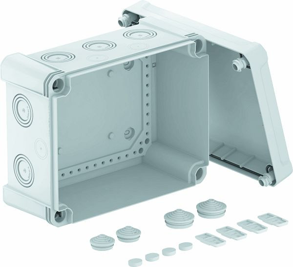 Kabelabzweigkasten zum Verbinden von Kabeln und Leitungen im Innen- und Außenbereich. Rechteckige Form mit Ausschlageinführungen. Geeignet für die Wand-/ Deckenmontage mit der Möglichkeit zur Außenbefestigung, Innenbefestigung oder Montage über die Eckdome. Besonders schlagfest mit IK09. Deckel mit Schnellverschluss, plombierbar. Hergestellt aus halogenfreien und UV-resistenten Materialien. Kabelabzweigkasten gemäß DIN EN 60670. Flammwidrig nach DIN EN 60695-2-11, Prüftemperatur 650°C. Schlagfestigkeit IK09 gemäß DIN EN 50102. Schutzart IP67 gemäß DIN EN 60529.