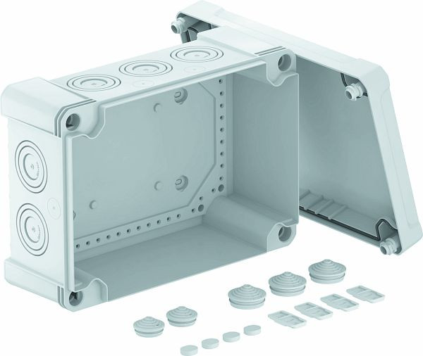 Kabelabzweigkasten zum Verbinden von Kabeln und Leitungen im Innen- und Außenbereich. Rechteckige Form mit Ausschlageinführungen. Geeignet für die Wand-/ Deckenmontage mit der Möglichkeit zur Außenbefestigung, Innenbefestigung oder Montage über die Eckdome. Besonders schlagfest mit IK09. Deckel mit Schnellverschluss, plombierbar. Hergestellt aus halogenfreien und UV-resistenten Materialien.