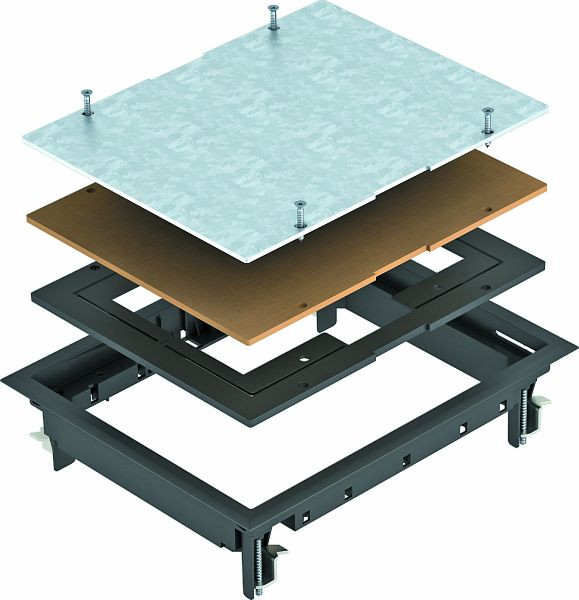 Zugdoseneinsatz zum Blindverschluss einer rechteckigen Montageöffnung der Nenngröße 6 in einem Unterflur-System oder Doppelboden im Innenbereich. Teppichschutzrahmen aus Polyamid.