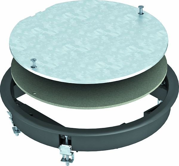 Zugdoseneinsatz zum Blindverschluss einer runden Montageöffnung der Nenngröße R4, Einsatz in Kanalsystemen und Systemböden im Innenbereich.