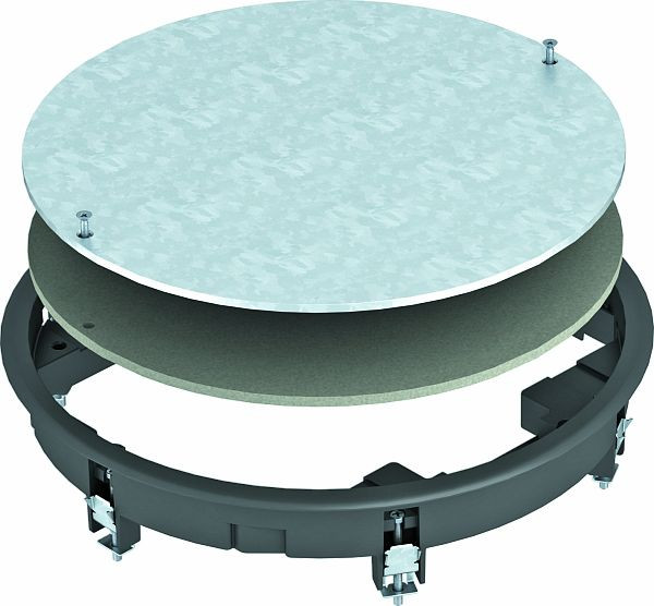 Zugdoseneinsatz zum Blindverschluss einer runden Montageöffnung der Nenngröße R7 in Kanalsystemen sowie in Doppel- und Hohlböden im Innenbereich. Mit Universalbefestigungswinkel.