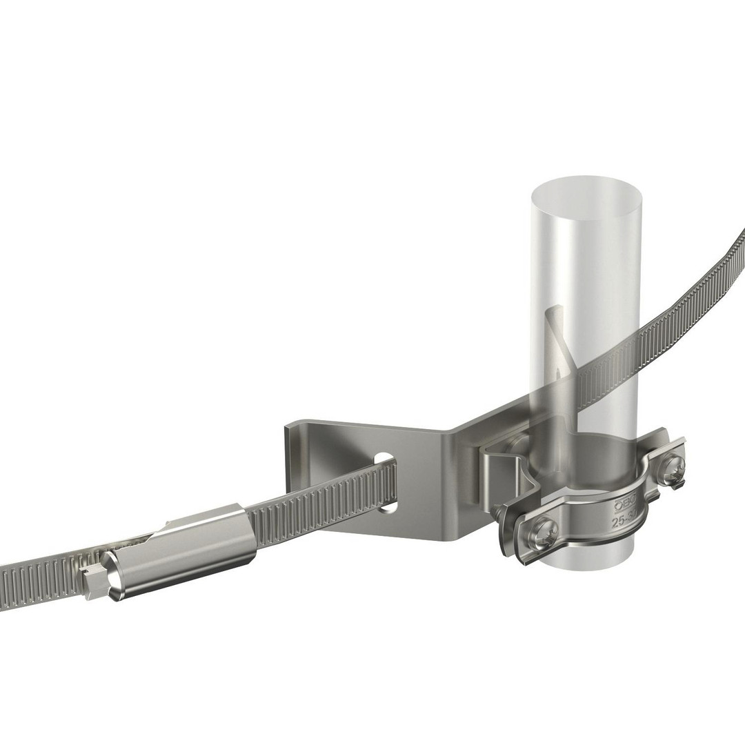 Leitungshalter mit Spannband für isCon®-Ableitung, zum Montieren an Rohren mit ø = 600 mm. Inklusive Federscheiben zur Schraubsicherung gegen Selbstlockern.