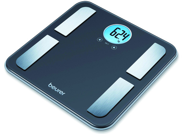 Sicherheitsglas, moderne Rahmung, runde beleuchtete LCD Anzeige, Ziffernhöhe 28 mm, Elektroden aus gebürstetem Edelstahl, Körpergewicht, -fett, -wasser, Muskelanteil, Knochenmasse, Kalorienanzeige (AMR), Einteilung: 100 g/0,1%, 5 Aktivitätsgrade, 10 Speicherplätze, Einschalttechnik: Quick Start, Umstellung von kg/lb/st, inkl. 2 x 3V Batterien CR2032, 5 Jahre Garantie