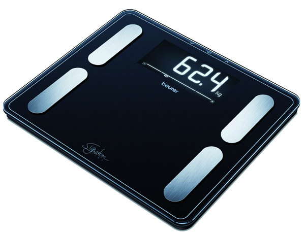 Wiegefläche aus 8mm Sicherheitsglas im unverwechselbaren SignatureLine-Look, beleuchtetes XXL-Display, 45 mm Ziffernhöhe, Elektroden aus gebürstetem Edelstahl, Körpergewicht, -fett, -wasser, Muskelanteil, Knochenmasse, Kalorienanzeige AMR/BMR, BMI Berechnung, Interpretation der Messwerte, Einteilung: 100 g/0,1%, 5 Aktivitätsgrade, 10 Speicherplätze, Einschalt-Technik Quick-Start, Umstellung von kg/lb/st, inkl. 3 x 1,5V Batterien AAA, 5 Jahre Garantie