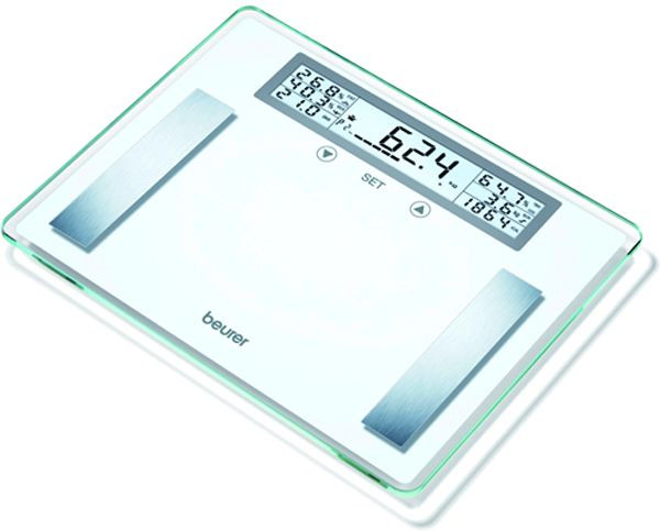 riesige Trittfläche aus extra starkem 8 mm Sicherheitsglas, LC-Display mit Multi-Anzeige, Ziffernhöhe (Gewicht) 28 mm, Elektroden aus gebürstetem Edelstahl, Körpergewicht, -fett, -wasser, Muskelanteil, Knochenmasse, Kalorienanzeige AMR, BMI-Berechnung, Interpretation der Körperfettwerte, Einteilung: 100 g/0,1%/1Kcal, 5 Aktivitätsgrade, 10 Benutzerspeicherplätze, Einschalttechnik: Quick-Start, Umstellung von kg/lb/st, inkl. 4 x 1,5V Batterien, 5 Jahre Garantie