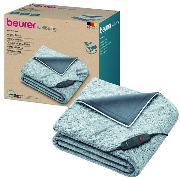 kuscheliges Flauschmaterial, Ober- und Unterseite aus 100 % recycletem Material, Öko-Tex Standard 100, elektronische Temperaturregelung, beleuchtete Funktionsanzeige, Abschaltautomatik nach ca. 3 Std., abnehmbarer Schalter, BSS-Überhitzungsschutz, 3 Jahre Garantie