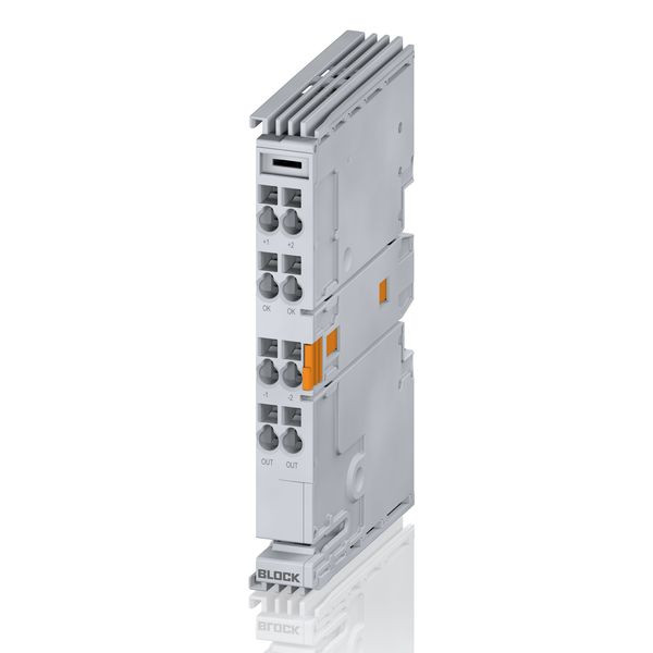 - Zweipoliger Potenzialtrenner mit galvanischer Trennung, zum rechtsseitigen Anreihen an Schutzschalterkanäle mit Einzelmeldesignal.