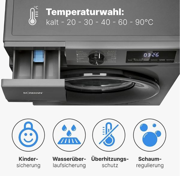 LED-Display mit Endezeitvorwahl 1-24 Std. und Restlaufzeitanzeige; Schaumregulierung, Zusatzoptionen: Vorwäsche, Extra Spülen, Intensiv; 15 Programme: Eco 40-60, Baumwolle, Synthetik, Mix, Wolle, Express 15', Hygiene, Babykleidung, Dunjkle Wäsche, Sportkleidung, Oberbett, 20°, Spülen und Schleudern, Schleudern, Trommelreinigung; Wasserüberlaufsicherung, Kindersicherung, Fremdkörperfalle, Inverter Motor - 10 Jahre Motorgarantie