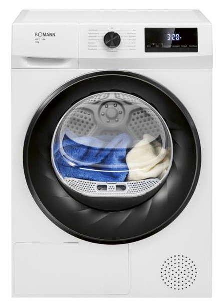 Wärmepumpentrockner 8,0 kg Fassungsvermögen, Drehwähler für Programme, 15 Programme, Trommelreversierfunktion, Startzeitvorwahl,, h, Knitterschutzphase nach Programmende, Kindersicherung, LED Display, weiß, Restzeitanzeige, Filtersättigungsanzeige, Anzeige: Kondenswasser voll, Innenbeleuchtung LED, Trommel verzinkt