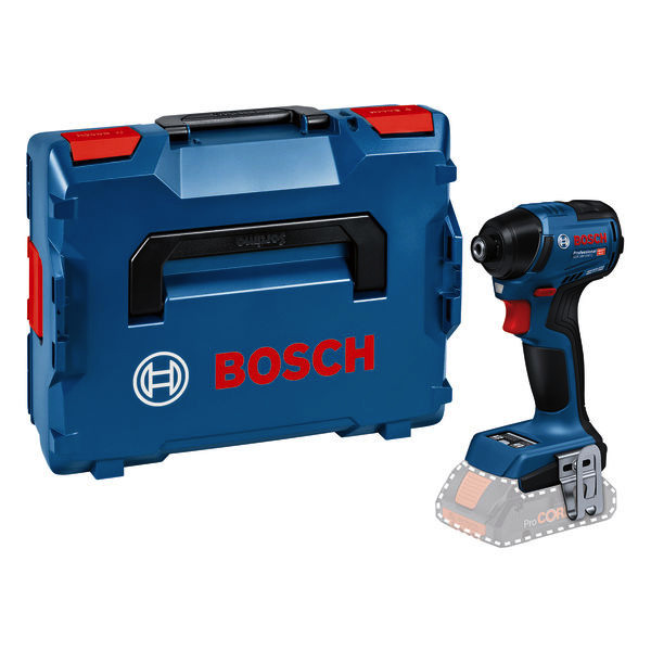 Akku-Drehschlagschrauber GDR 18V-220 C, Leichtgängiges Einschrauben von Schrauben in Holz und Blech erfordert ein Werkzeug, das Leistung mit Kontrolle kombiniert. Der GDR 18V-220 C Professional mit ¼"-Innensechskantaufnahme ist ein durchzugsstarker, kompakter Drehschlagschrauber mit Zusatzfunktionen. Mit einer Kopflänge von 113 mm ist er leichter zu handhaben, besonders bei Arbeiten an engen Stellen. Dank leistungsstarkem, bürstenlosem Motor mit bis zu 3.400 min?¹, drei Drehzahlstufen und einem hohen Drehmoment von 220 Nm, lässt sich die Arbeit schneller und kontrollierter erledigen. Die Einstellmöglichkeit des Schraubmodus sorgt für eine kontrollierte Anwendung, indem der Drehschlagschrauber langsamer wird (A) oder abschaltet (B), um gebrochene Schraubenköpfe und beschädigte Werkstücke zu vermeiden. Weitere Betriebsarten stehen über die Bosch Toolbox App zur Verfügung und sind dort individuell einstellbar. Bits können einhändig eingesteckt werden - einfach auf das Bit drücken und es rastet ein. Das Doppelkugellager sorgt für einen festen Halt des Bits und höhere Präzision. Die zwei LED-Lichter, eins am Kopf und eins am Fuß des Schraubers, liefern eine erstklassige Beleuchtung des Arbeitsplatzes. Ganz im Sinne der Profi-Handwerker verfügt das Werkzeug über ein Vollmetallgetriebegehäuse. Das Werkzeug ist mit Statusanzeige und Gürtelclip ausgestattet. Es ist kompatibel mit dem Bosch Professional 18V System und mit der markenübergreifenden AMPShare Akku-Allianz. Kraftvoller und kompakter Drehschlagschrauber für Spitzenergebnisse bei SHK-Projekten, Elektroarbeiten oder Schreinerarbeiten. 1 x Bluetooth Low Energy Modul GCY 42 Professional (1 600 A01 6NH). 1 x Gürtelclip, 1 x Bithalter. L-BOXX-Volleinlage für die Werkzeugaufbewahrung (1 600 A03 2H0). L-BOXX 136 (1 600 A01 2G0)