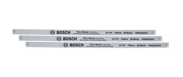 Handwerkzeuge Bügelsägeblätter 150 mm 24 TPI 3 Stück. Feine Bosch Universal-Bügelsägeblätter 150 mm für präzise Schnitte. Feine Sägeblätter mit 24 TPI für präzise Schnitte in Metall, Kunststoff und Weichholz. Scharfe Zähne mit einer Härte von 62-68 HRC für hervorragende Schneidleistung. Aus robustem Bimetall für hohe Langlebigkeit. Ideal für die Bosch Bügelsäge 150mm und andere Universal-Bügelsägen