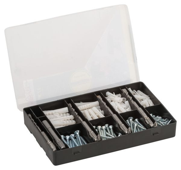 | Kurzbeschreibung | Fixier-Set 173-teilig, Bohrer, Dübel, Schrauben, Bits in handlicher Sortierbox. |