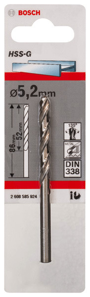 | Kurzbeschreibung | Metallbohrer HSS-G, DIN 338, 5,2 x 52 x 86 mm, 1er-Pack |