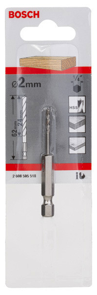 | Kurzbeschreibung | Holzspiralbohrer mit 1/4-Zoll Sechskantschaft, 2 x 24 x 62 mm |