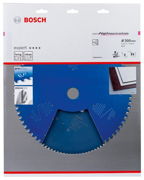 Expert for High Pressure Laminate Kreissägeblatt für das Schneiden von Hochdruck-Schichtpressstoffplatten. Das Blatt ist mit Extra Hard Microteq-Zähnen versehen, die bei Bosch in Eigenproduktion aus hochgradig robustem Carbide-Korn gefertigt werden. Die gute Qualität, die Holzarbeiter erwarten, die Fähigkeit, extreme Bedingungen bei professionellen Konstruktionen zu bewältigen. Die Schutzbeschichtung des Blatts fördert diese hohe Leistung, sie verhindert Korrosion, ermöglicht zuverlässiges Schneiden und reduziert dabei Reibung. Das Produkt ist mit Dämpfungsschlitzen für einen besonders ruhigen Lauf, deutlich weniger Geräusche und spürbar geringere Vibration ausgestattet. Dieses Sägeblatt bei Hochdruck-Schichtpressstoffplatten verwenden. Mit HLTCG-Zähnen (High-Low Triple Chip Ground) ist das Kreissägeblatt Expert for High Pressure Laminate robust auf die Arbeit mit abrasivem Material ausgelegt.