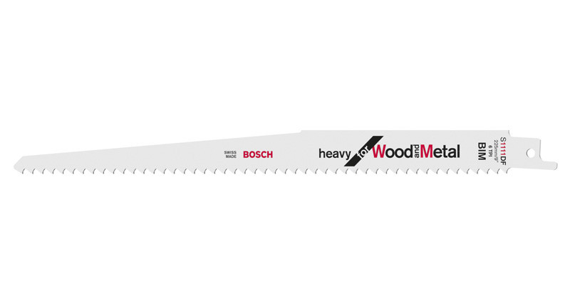 Das S 1111 DF Heavy for Wood and Metal Säbelsägeblatt eignet sich für schnelle Schnitte in Holz und Metall. Es verfügt über eine große Zahnteilung (4,3 mm) und geschränkte Zähne für schnelle Ergebnisse. Zudem bietet die mittlere Wandstärke (1,25 mm) die beste Balance zwischen Geschwindigkeit, Flexibilität und Stabilität beim Schneiden. Das Bimetallblatt ist für das Schneiden von weichen Nägeln, Baustahl und NE-Metallkomponenten in Holz optimiert. Es verfügt über eine Standardlänge von 225 mm mit einer Schnittleistung von bis zu 175 mm.