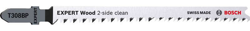 Hochpräzises, ausrissfreies Schneiden von Holz! Extrascharfe Zähne durch Präzisionsschliff Unter Tischlern und Schreinern war es schon immer eine Kunst sicherzustellen, dass der sichtbare Teil des Arbeitsmaterials die ?saubere Seite? eines Stichsägenschnitts zeigt. Manchmal muss man das Werkstück zum Sägen umdrehen. Oder die Stichsäge sägt von der Rückseite, um die gewünschte Schnittqualität auf der Sichtseite zu haben. Oder du verwendest das EXPERT Wood 2-side clean-Blatt, das dank seiner Zahngeometrie auf beiden Seiten einen perfekten, ausrissfreien Schnitt bietet. Mit seinen besonders scharfen, präzisionsgeschliffenen Zähnen eignet sich das Bosch EXPERT Wood 2-side clean-Stichsägeblatt gut zum Schneiden von Weichholz mit einer Dicke von bis zu 50 mm. Möbelschreiner können ein perfektes Ergebnis erzielen und verlieren nicht nach jedem Stichsägenschnitt Zeit durch Schleifen. Erhältlich für gerade Schnitte (T308B), für Kurvenschnitte (T308BO) und für genaue Winkelschnitte (T308BP). Ausrissfreie Schnitte mit 2-side Clean Geometry