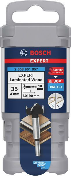 Überragende Lebensdauer beim Bohren in Schichtholz! Feingeschliffene, scharfe Hochleistungs-Carbide-Spitze Die Montage von Scharnieren erfordert sauber gesetzte Bohrungen, für die wiederum ein Scharnierbohrer benötigt wird, der lange seine Schärfe hält und perfekte Bohrungen ohne Splitter ermöglicht. Dafür haben wir den EXPERT Laminated Wood entwickelt - unseren außergewöhnlich langlebigen Scharnierbohrer, mit dem sich saubere und präzise Löcher in Schichtholz und Sperrholz bohren lassen. Ob saubere, splitterfreie Löcher für Türscharniere, Senkbohrungen oder andere Arten von Bohrungen in Holz, mit dem EXPERT Laminated Wood und seinen scharfen Carbide-Schneidkanten schaffen Sie jede Arbeit mit Leichtigkeit. Der Bohrer wurde für den Einsatz an Stationärmaschinen entwickelt. Überragende Lebensdauer dank Bosch Carbide Technology