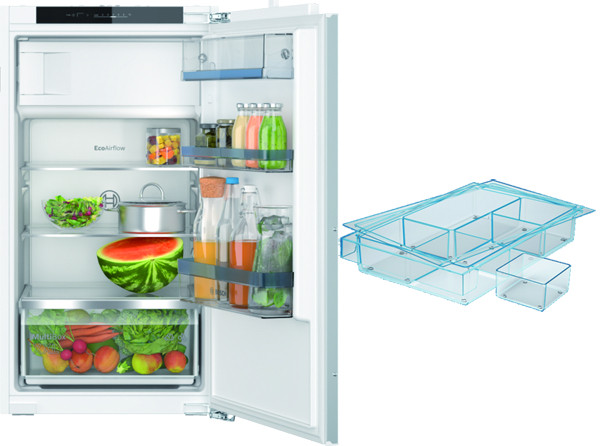 Einbau-Kühlschrank KIL 32VFE0: elektronische Temperaturregelung über LED ablesbar, Warnsignal Tür offen, Kühlteil: Eco Airflow, SuperKühlen, LED Beleuchtung, 3 Abstellflächen aus Sicherheitsglas, davon 2 höhenverstellbar, transparente MultiBox mit Wellenboden für Obst und Gemüse; 4-Sterne-Gefrierfach: SuperGefrieren; Türanschlag rechts, wechselbar