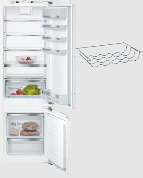 Einbau-Kühl-/Gefrierkombination KIS 87ADD0: TouchControl - elektronische Temperaturregelung exakt digital ablesbar, FreshSense: konstante Temperatur durch intelligente Sensortechnik, getrennte Temperaturregelung für Kühl- und Gefrierraum, optischer und akustischer Alarm bei Temperaturanstieg mit Memory-Funktion, akustischer Türalarm, Urlaubsschaltung, Kühlteil: Super-Kühlen, LED-Beleuchtung, 5 Abstellflächen aus Sicherheitsglas (4 höhenverstellbar), davon 1 ausziehbar und 1 teilbar mit Parkmöglichkeit im Gerät, VitaFresh plus Box hält frische Lebensmittel bis zu 2x länger frisch, Gefrierteil: Super Gefrieren mit Eingefrierautomatik, LowFrost: geringere Eisbildung, schnelleres Abtauen, 2 transparente Gefriergut-Schubladen, davon 1 BigBox, Vario-Zone - für flexible Nutzung des Gefrierraums, Türanschlag rechts, wechselbar