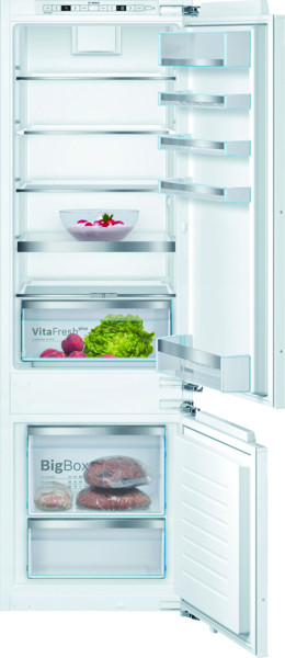 Flachscharnier, Profi-Türdämpfung Leistung und Verbrauch Energieeffizienzklasse: D Energieverbrauch / Jahr: 165 kWh/a Geräuscheffizienzklasse / Geräusch-Wert: B / 35 dB Nutzinhalt gesamt: 270 l Design LED Beleuchtung Komfort und Sicherheit LowFrost - geringere Eisbildung, schnelleres Abtauen TouchControl - Elektronische Temperaturregelung digital ablesbar Getrennte Temperaturregelung für Kühl- und Gefrierraum Super-Taste: Super Kühlen Super Gefrieren mit Eingefrierautomatik FreshSense - Konstante Temperatur durch intelligente Sensortechnik Akustischer Türalarm bei geöffneter Tür Optischer und akustischer Alarm bei Temperaturanstieg, mit Memory-Funktion Urlaubsschaltung Kühlteil Nutzinhalt Kühlfächer: 208 l 5 Abstellflächen aus Sicherheitsglas, davon 4 höhenverstellbar 5 Türabsteller, davon 1 Flaschenabsteller Frischhaltesystem VitaFresh plus: hält frische Lebensmittel bis zu zweimal länger frisch Gefrierteil Nutzinhalt Tiefkühlfächer: 62 l Gefriervermögen in 24 Std.: 5 kg Lagerzeit bei Störung : 12 h 2transparente Gefriergut-Schubladen, davon 1 BigBox VarioZone: herausnehmbare Sicherheitsglasablagen für eine flexible Nutzung des Gefrierraums Maße Gerätemaße ( H x B x T): 177.2 cm x 55.8 cm x 54.5 cm Nischenmaße (H x B x T): 177.5 cm x 56.0 cm x 55.0 cm Technische Informationen Türanschlag rechts, wechselbar 220 - 240 V Anschlusswert: 120 W Klimaklasse: SN-ST Zubehör 1 x Eiswürfelschale, 1 x Flaschenkamm in Türabsteller Länderspezifische Optionen Auf Basis der Ergebnisse der Normprüfung über 24 Std. Tatsächlicher Verbrauch abhängig von Nutzung/Standort des Geräts.