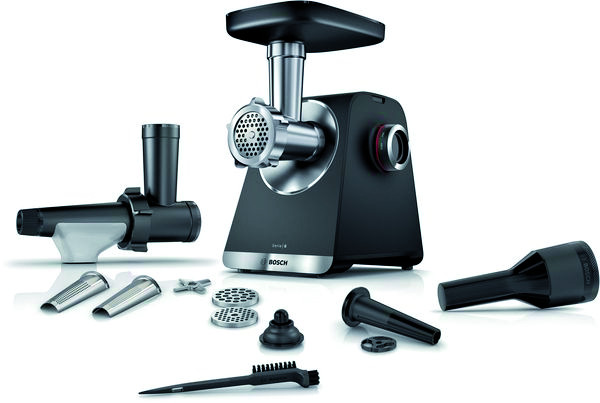 schnelles Verarbeiten von großen Mengen 3,5 kg/Min., Kammergröße 8, Metallkupplung, 2 Geschwindigkeitsstufen, Rücklauffunktion, Planetengetriebe, Messer beidseitig geschärft, Mahlscheiben in verschiedenen Größen, gelochte Scheiben aus rostfreiem Stahl (3 mm, 4,5 mm und 8 mm), Wurststopfer, Kebbe-Aufsatz, Fruchtpressenvorsatz, Aufbewahrung des Zubehörs im Stopfer, Kabelaufbewahrungsfach, 10 Jahre Motorgarantie
