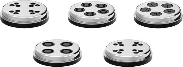 passend für den OptiMUM Fleischwolf, 5 verschiedene Pasta-Scheiben für vielfältige, selbstgemachte Nudel-Kreationen (Ditaloni rigati, Cellentani, Rigatoni, Fussili, Maccheroni), Metall