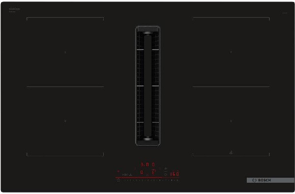 Das Bosch PVQ811H26E Serie 6 ist ein 80 cm breites, rahmenloses Induktionskochfeld mit integriertem Downdraft-Abzugssystem. Es bietet Flexibilität durch zwei Combi-Zonen, DirectSelect-Bedienung und 17 Leistungsstufen. Die Home Connect-Funktion ermöglicht die Steuerung per App und Zugriff auf zusätzliche Funktionen. Für effizientes Kochen sorgen PowerBoost, QuickStart und ReStart. Der integrierte Kochassistent und 11 Bratbereiche verhindern Anbrennen. Das Downdraft-System mit EcoSilence Drive Motor, Clean Air Plus Filtern und automatischer Aktivierung/Deaktivierung sorgt für saubere Luft. Das Kochfeld bietet eine 2-stufige Restwärmeanzeige, Kindersicherung und automatische Sicherheitsabschaltung. Umluft- und Abluftbetrieb sind möglich, wobei das entsprechende Zubehör beiliegt oder separat erhältlich ist.
