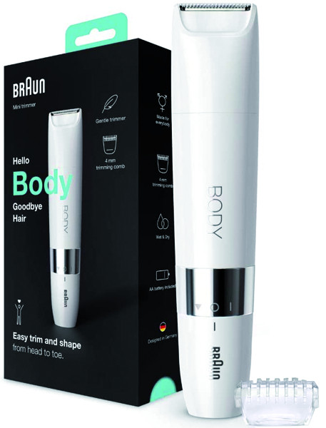 Körperrasierer mit Trimmeraufsatz (4 mm) für Sie und Ihn, Mini-Größe für unterwegs - immer mit dabei, Wet & Dry - 100% wasserdicht, inkl. 1 Batterie AA, Reinigungsbürste