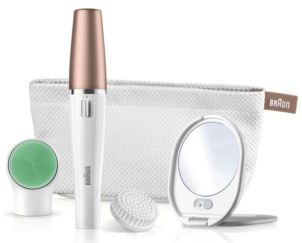 3-in-1 Gesichtsreiniguing, -epilation und Pflege Gesichtsepilierer: entfernt präzise die Gesichtshärchen, Gesichtsreinigungsbürste:reinigt die Haut porentief, vitalisierende Aufsatz: sorgt für eine glattere Haut, zusätzliche AA-Batterie, beleuchteter Spiegel, Aufbewahrungstasche