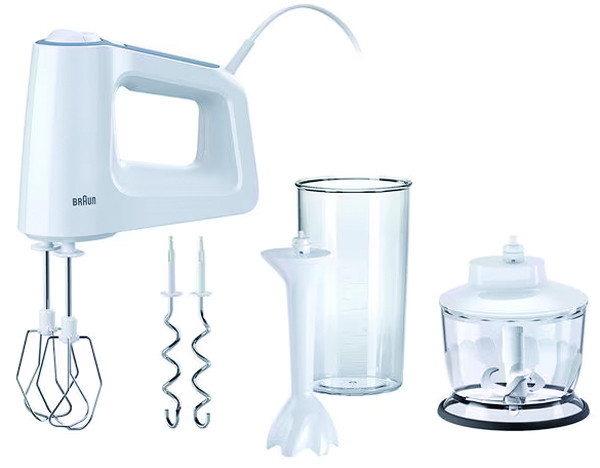 5 variable Geschwindigkeitsstufen und Turbo-Funktion, SmartMix-Technologie (Platzierung des Motors direkt über den Zubehörteilen, das Gewicht wird direkt in die Schüssel verlagert), je 2 Edelstahl-Schneebesen/Knethaken, Zerkleinerer 500 ml, Kunststoff-PowerBell-Mixfuß, Mix- und Messbecher 600 ml, ergonomischer Soft-Griff