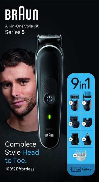 9-in-1-Set: 1 Trimmer mit Kunststoff-Trimmeraufsatz, 1 Trimmeraufsatz für Ohren- und Nasenhaartrimmer, 1 Mini-Präzisionsscherkopf, 1 verschiebbarer Bart-Kammaufsatz (3 - 11 mm), 1 verschiebbarer Haar-Kammaufsatz (13 - 21 mm), 2 feste Kammaufsätze (1 und 2 mm), 1 Sensitiv-Kammaufsatz, 1 Präzisions-Kammaufsatz; ultrascharfe Klinge, vollständig abwaschbar - 100 % wasserdicht, Li-Ionen-Akku, Akkukapazität ca. 100 Min., Aufbewahrungstasche