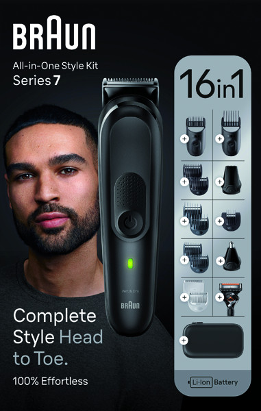 12-in-1-Set: 1 Trimmer, 1 Metall-Trimmeraufsatz, 1 Bodygroomer-Aufsatz, 1 Detail-Trimmerkopf, 1 Trimmeraufsatz für Ohren- und Nasenhaare, 1 verschiebbarer Bartkammaufsatz (3 - 11 mm), 1 verschiebbarer Haarkammaufsatz (13 - 21 mm), 1 fester Standard-Kammaufsatz (1 mm), 1 fester Standard-Kammaufsatz (2 mm), 1 Bartkammaufsatz, 1 Haarkammaufsatz, 1 Sensitiv-Kammaufsatz, 1 Augenbrauen-Kammaufsatz, 1 Gillette ProGlide Rasierer, 1 Gillette ProGlide Ersatzklinge; ultrascharfe Metallklinge, AutoSense-Technologie passt sich an die Haardichte an und sorgt für optimale Ergebnisse bei jedem Haartyp sowie bei jeder Haarlänge und -dicke, vollständig abwaschbar - 100 % wasserdicht, Li-Ionen-Akku, Akkukapazität ca. 100 Min., Ladestation, Reinigungsbürste, Organizer-Etui
