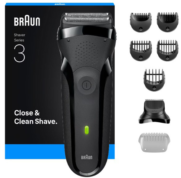 doppelte Scherfolie und integrierter Mitteltrimmer - passt sicher jeder Gesichtsform an, Barttrimmer-Aufsatz und 5 Kammaufsätze, 100% wasserdicht , Akkukapazität 30 Min., Schnell-Ladefunktion für eine Rasur 5 Min., Schutzkappe
