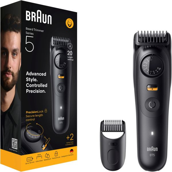 ultrascharfe Klinge, Präzisionsrad mit Feststelltaste und 20 Längeneinstellungen in präzisen 0,5-mm-Schritten, inkl. 1 Kammaufsatz, vollständig abwaschbar - 100 % wasserdicht, Li-Ion-Akku, Akkukapazität ca. 120 Min., Reinigungsbürste